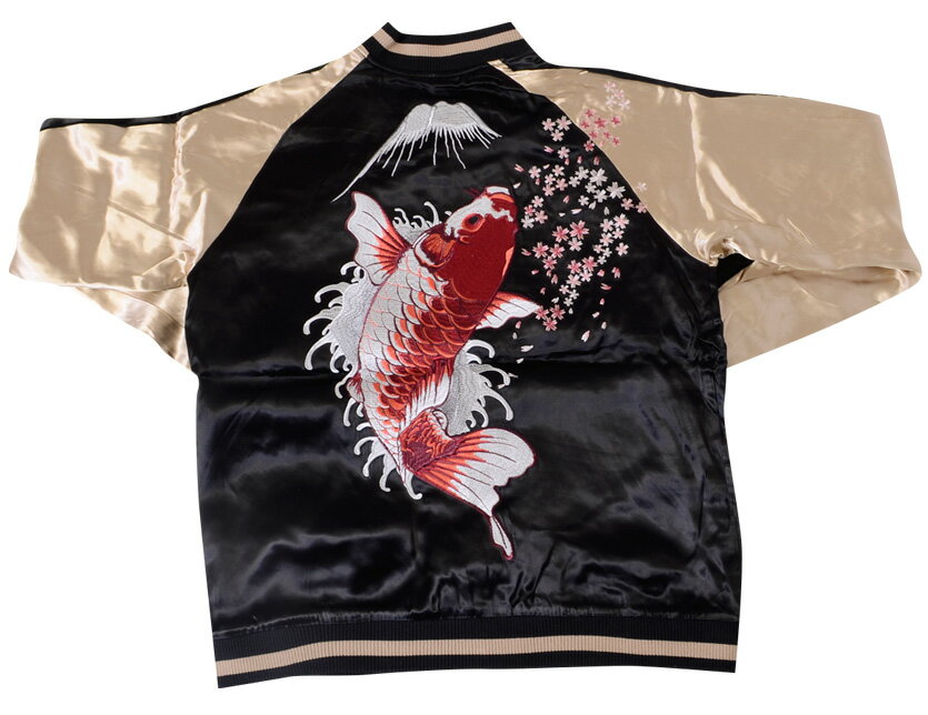 勢いのある構図で人気の跳ね鯉と優雅に咲く桜の花、 静と動の対比が美しい2つのモチーフを合わせたスカジャンです。