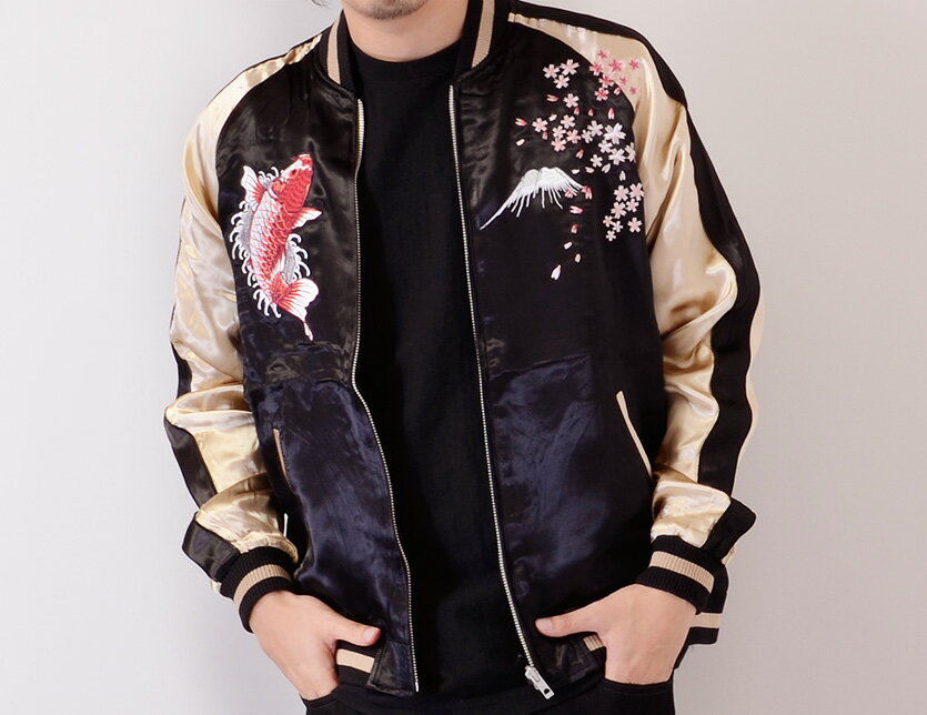 Bouncy Carp & Cherry Blossoms Embroidered Reversible Souvenir Jacket 跳ね鯉& 桜 刺繍 リバーシブル スーベニア ジャケット 海の向こうから見た和柄をメインテーマに日本に古くから伝わる和柄の魅力と、 海外の風を混ぜ合わせたユニークなデザインが特徴のジャパネスク。