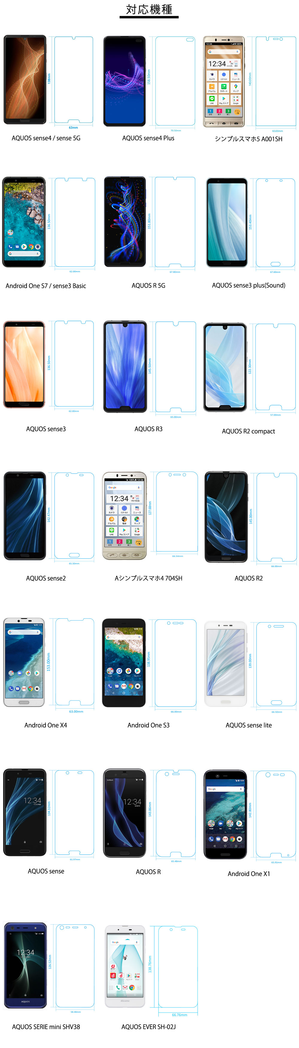 ■サイズ(縦×横) 機 種 縦 横 AQUOS sense4 / sense 5G 138.00mm 63.00mm AQUOS sense4 Plus 158.50mm 70.50mm シンプルスマホ5 A001SH 140.00mm 63.00mm Android One S7 / sense3 Basic 136.50mm 62.00mm AQUOS R 5G 151.80mm 67.80mm AQUOS sense3 plus(Sound) 153.40mm 67.60mm AQUOS sense3 136.50mm 62.00mm AQUOS R3 145.50mm 65.00mm AQUOS R2 compact 122.30mm 57.00mm AQUOS sense2 142.47mm 65.50mm シンプルスマホ4 704SH 127.68mm 66.54mm AQUOS R2 145.00mm 66.00mm Android One X4 153.00mm 63.00mm Android One S3 138.95mm 66.00mm AQUOS sense lite 139.00mm 66.50mm AQUOS sense 134.32mm 61.97mm AQUOS R 143.86mm 65.48mm Android One X1 142.80mm 65.91mm AQUOS SERIE mini SHV38 126.52mm 58.48mm AQUOS EVER SH-02J 138.76mm 66.76mm AQUOS EVER 134.47mm 62.00mm AQUOS U 137.01mm 67.03mm 商品説明 商品説明 簡単吸着で気泡0誰でも簡単に貼りつけて頂けます。